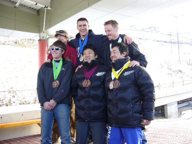 Race #2 awards. (L-R) TOP: Jon Montgomery (CAN; 2nd place), Chris Hedquist (USA; 1st), Keith Loach (CAN; 3rd). BOTTOM: Adam Donahoo (USA; 5th), Hiroyuki Maruyama (JPN; 6th), Yuuki Nozawa (JPN; 4th)