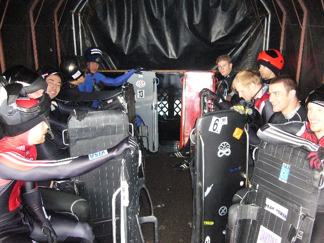 Post-race final truck ride. (L-R) Jon Montgomery (CAN), ?, Yuuki Nozawa (JPN), Hiroyuki Maruyama (JPN), Rob Murray (USA), John Daly (USA), Matt Antoine (USA), Steve Leason (CAN), Chris Hedquist (USA), Keith Loach (CAN).