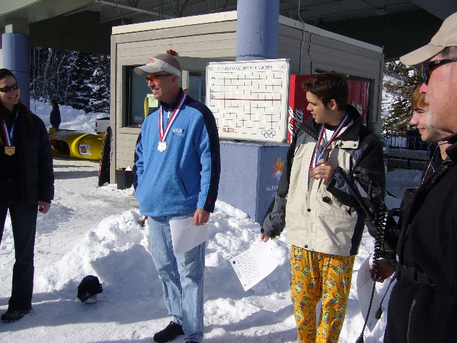 Dec. 2005 Park City Club Race #1 Awards. (L-R) Linda Cise, Scott Jager, Matt Revelli (nice pants!), Alan Blackwell.